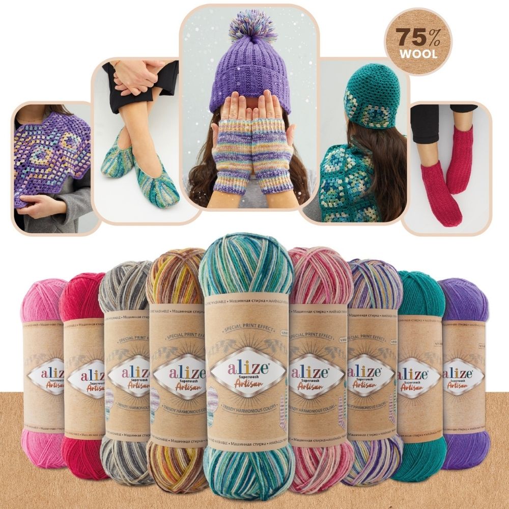 This yarn is perfect for creating soft and beautiful projects such as scarves, hats, and socks. With its multicolor pattern, it adds a vibrant touch to your creations. The yarn is known for its high quality and easy-care features, making it a favorite among knitting enthusiasts. Explore the endless possibilities of your knitting projects with Alize Superwash Artisan available in our store.