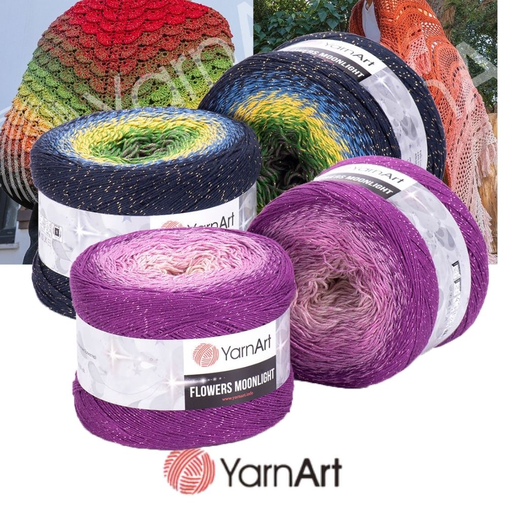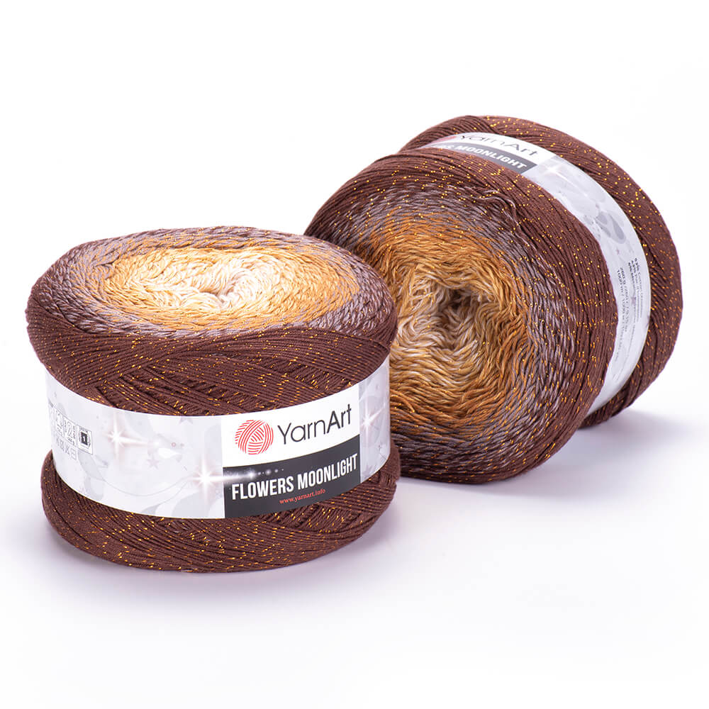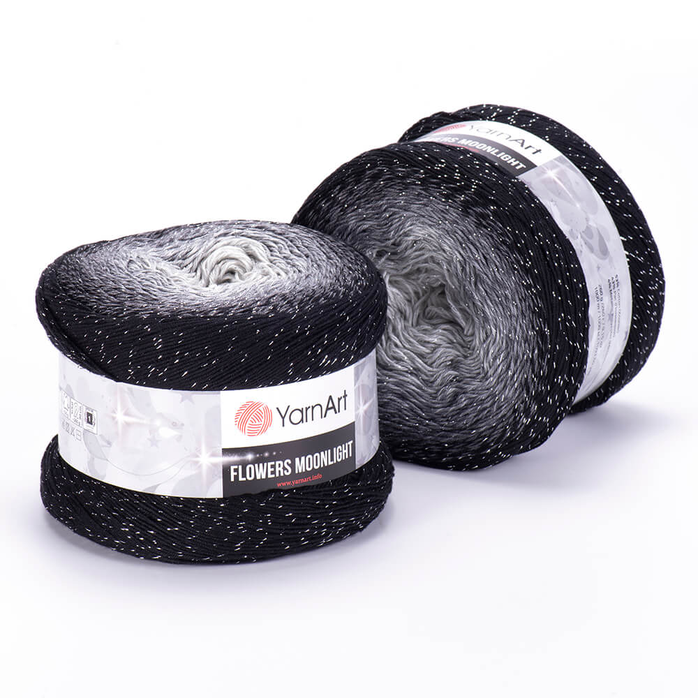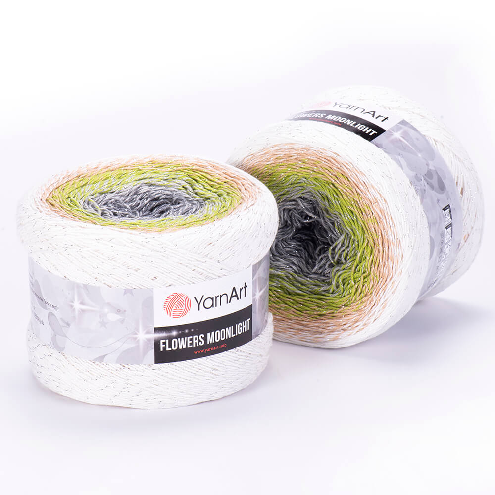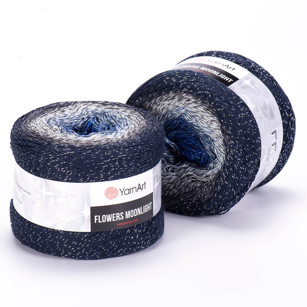 YarnArt Flowers Moonlight is created by adding metallic threads to the harmonious colors of the Flowers series. Thanks to its cotton content, Flowers Moonlight is ideal for summer garments such as shawls, dresses, blouses, cardigans, accessories and blankets. Its soft structure and variety of colors help you to create different designs in your handcrafts. This cake yarn is 1000 meter long, so you can knit or crochet a medium sized product with a ball.