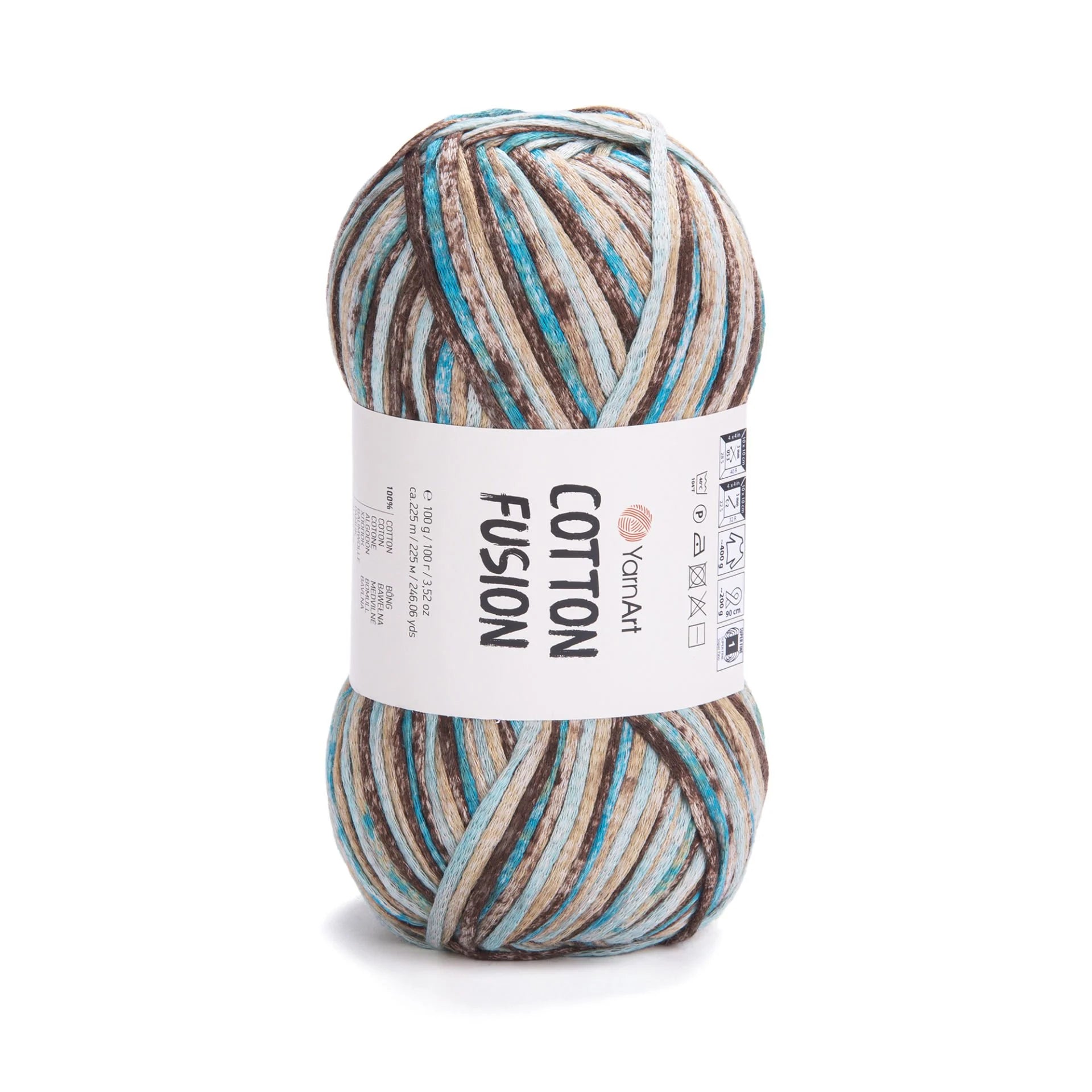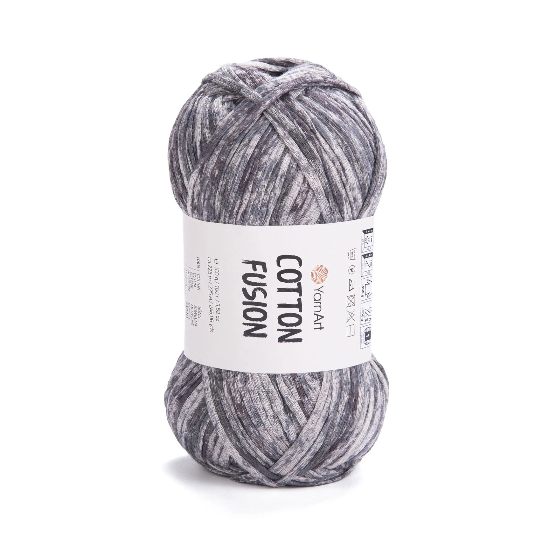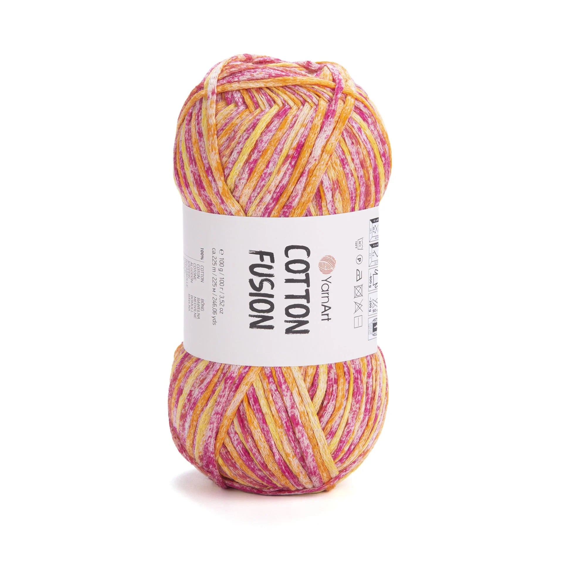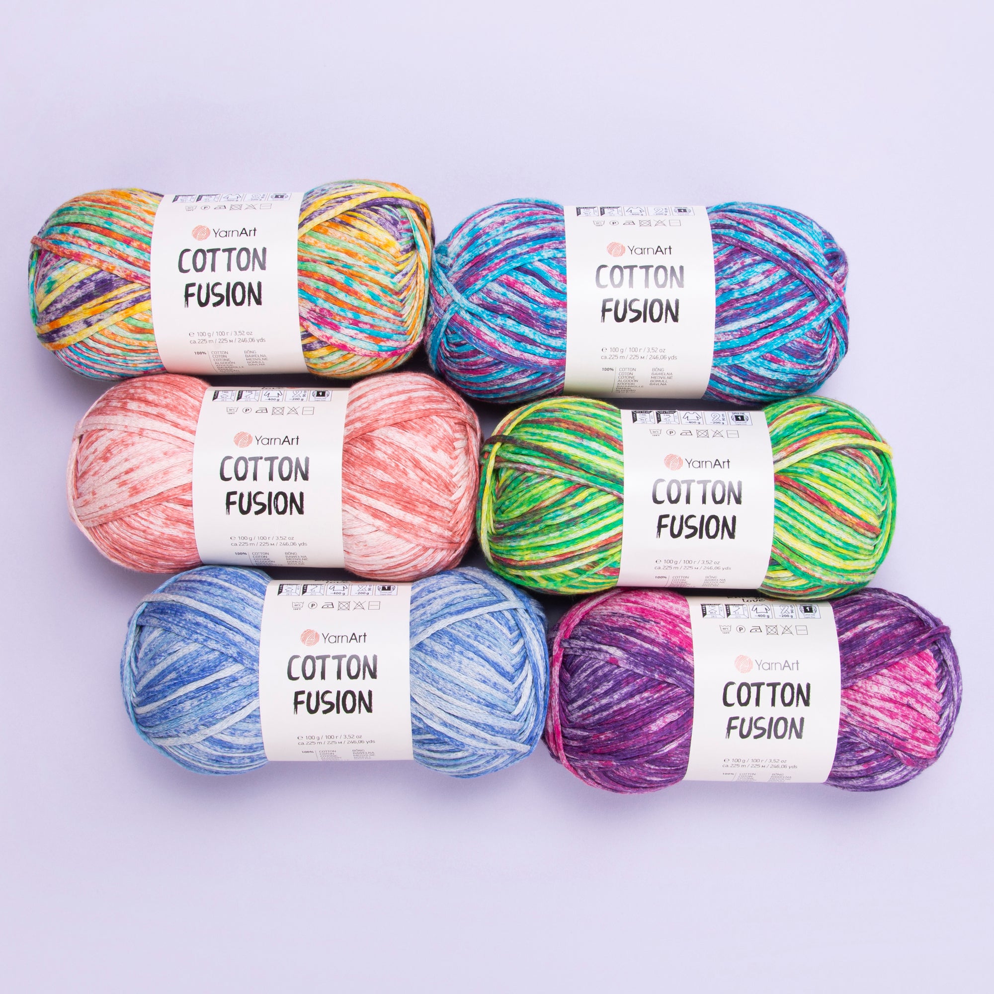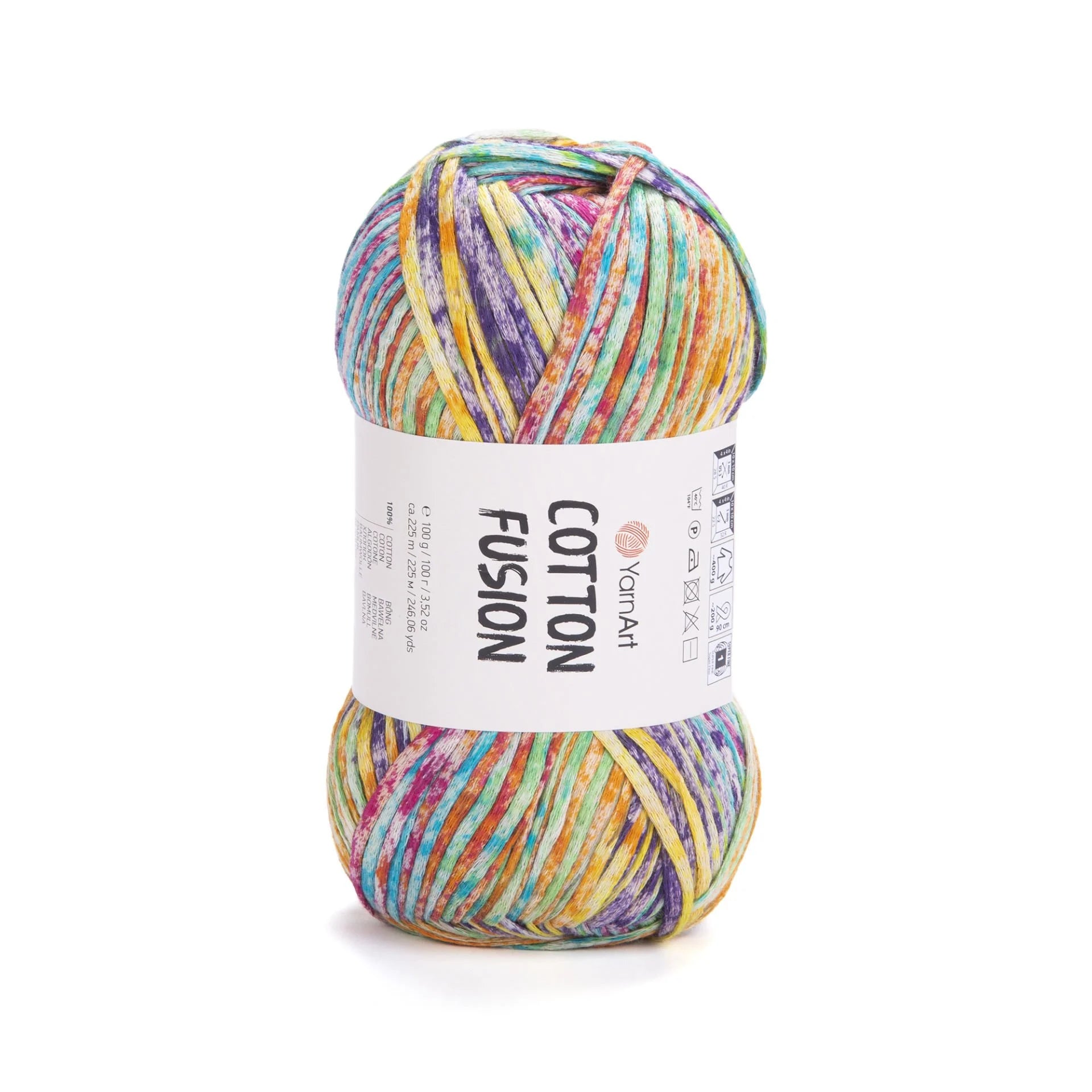 YarnArt Cotton Fusion is a vibrant, 100% cotton yarn featuring a flat, chain-stitch texture that resembles fabric. Available in 100g skeins with approximately 225 meters (246 yards) per ball, it's ideal for lightweight knitting and crochet projects.