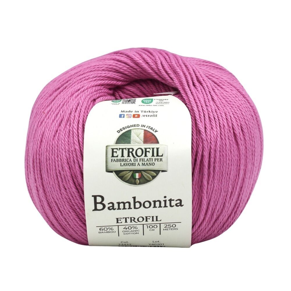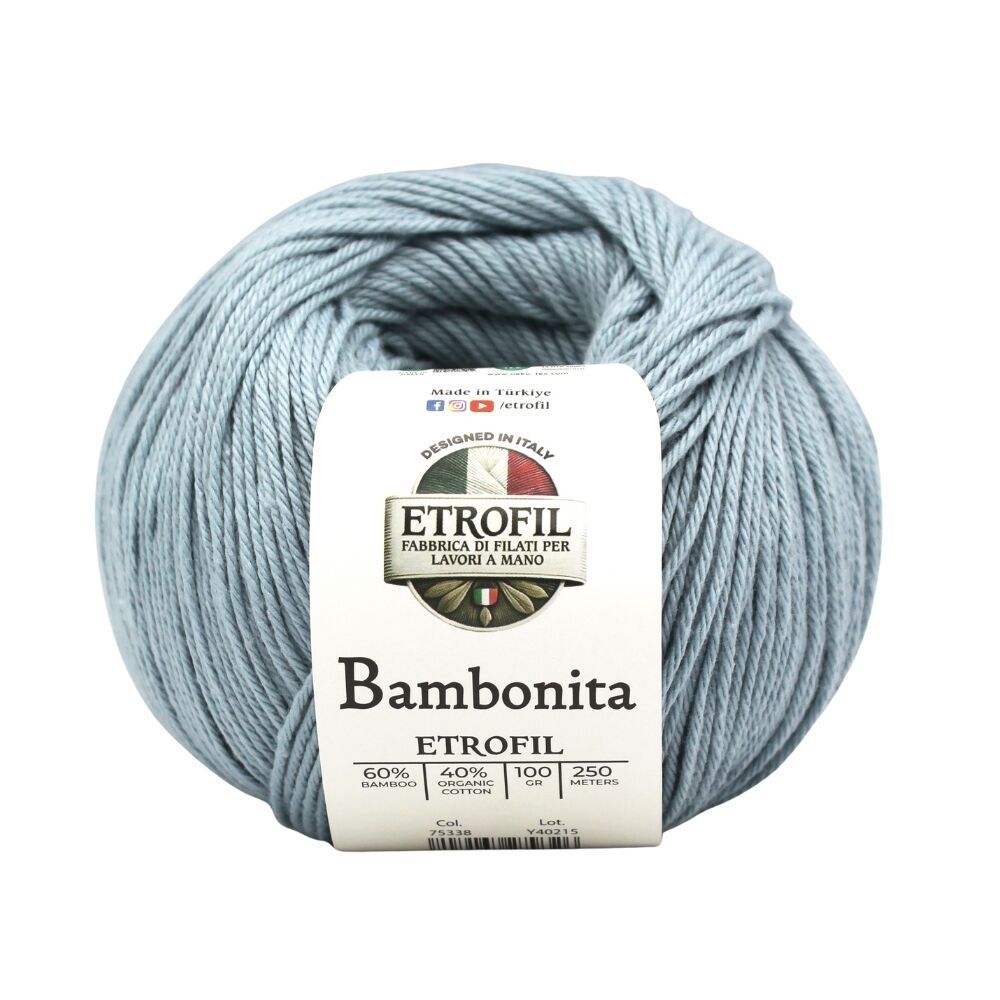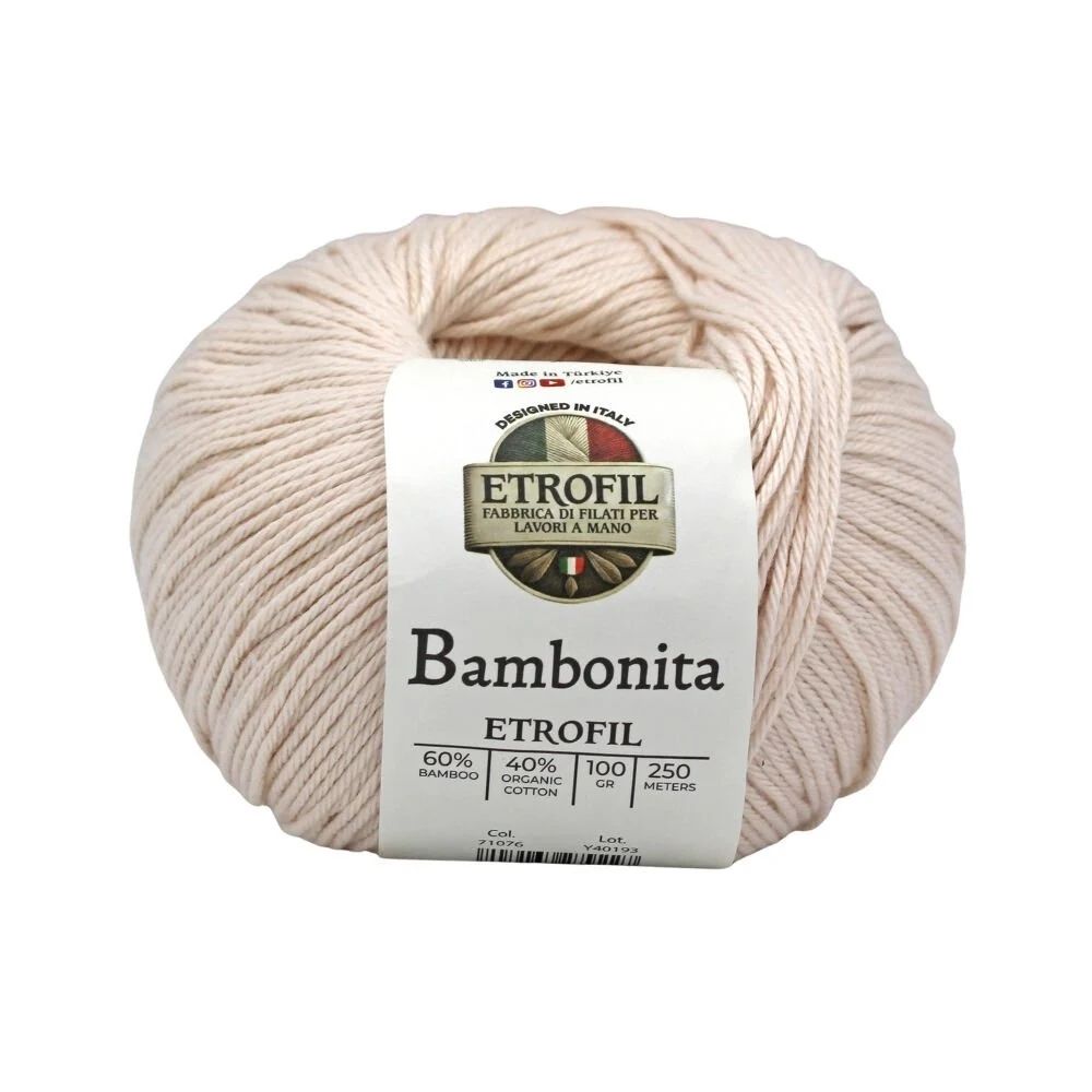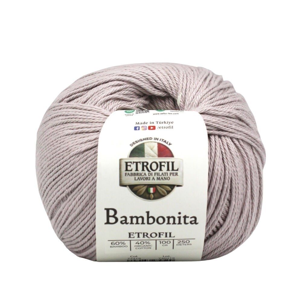 Etrofil Bambonita es un hilo ligero, transpirable y suave para la piel, elaborado con una mezcla natural de bambú y algodón orgánico. El bambú aporta brillo sedoso y frescura, mientras que el algodón ofrece comodidad y transpirabilidad.