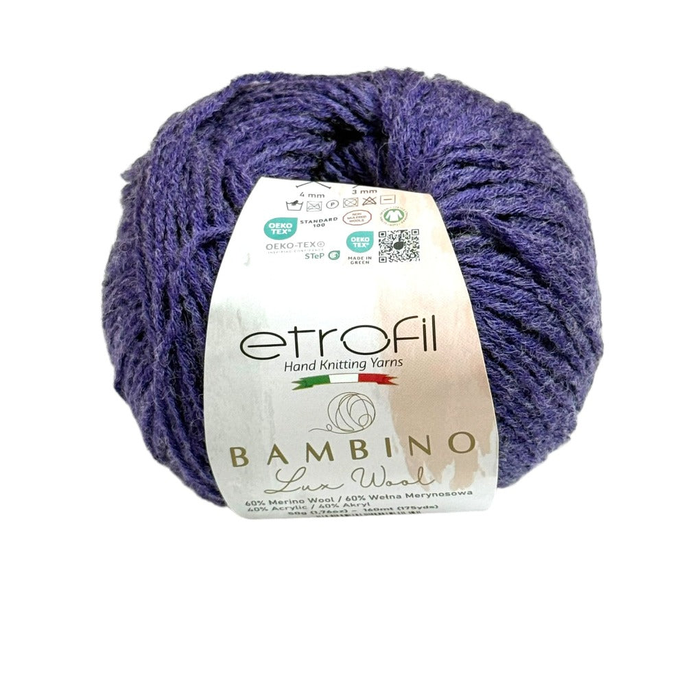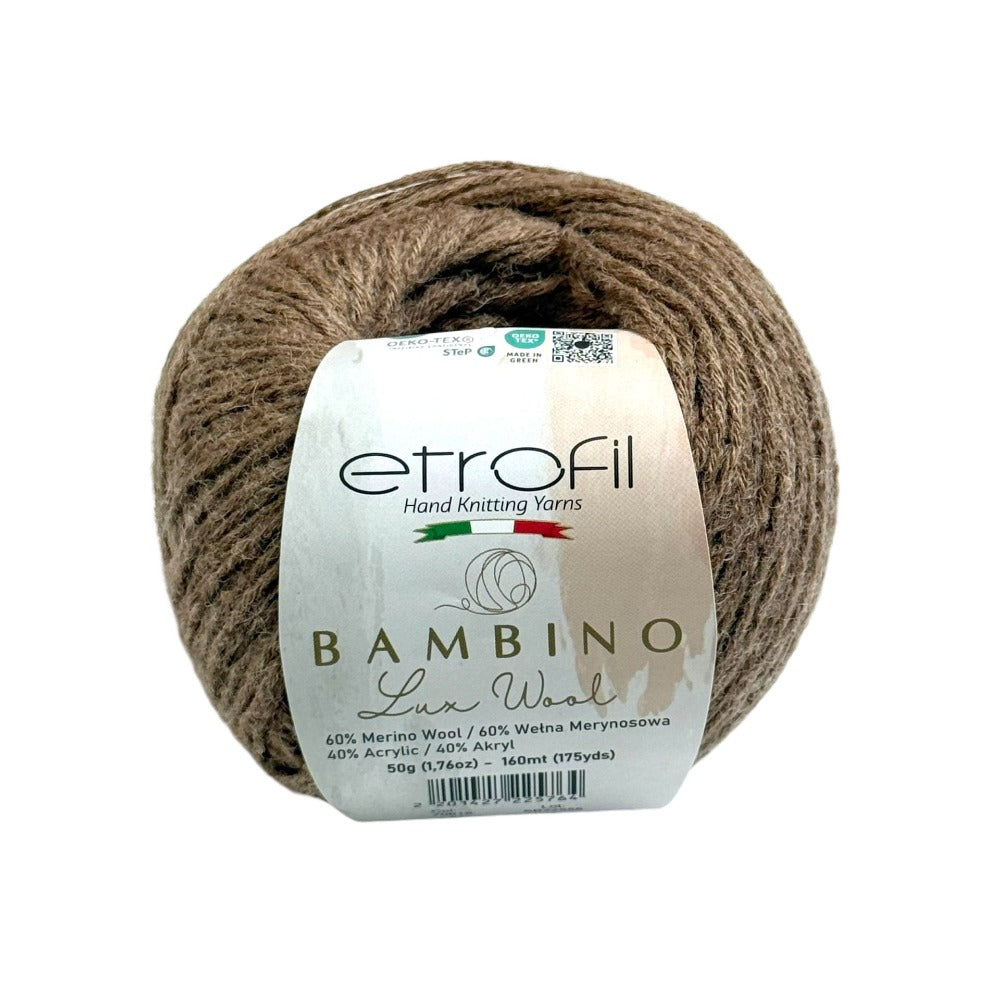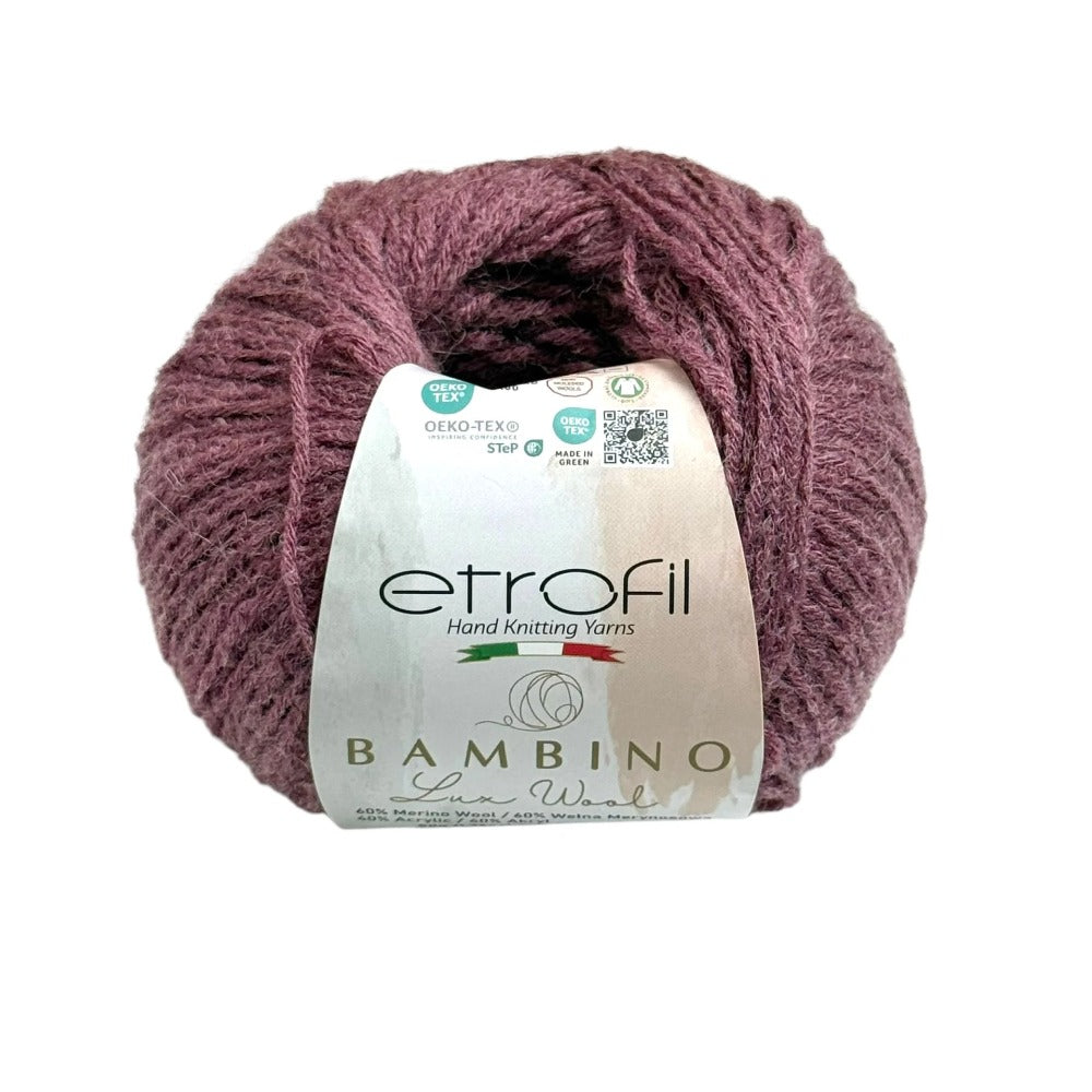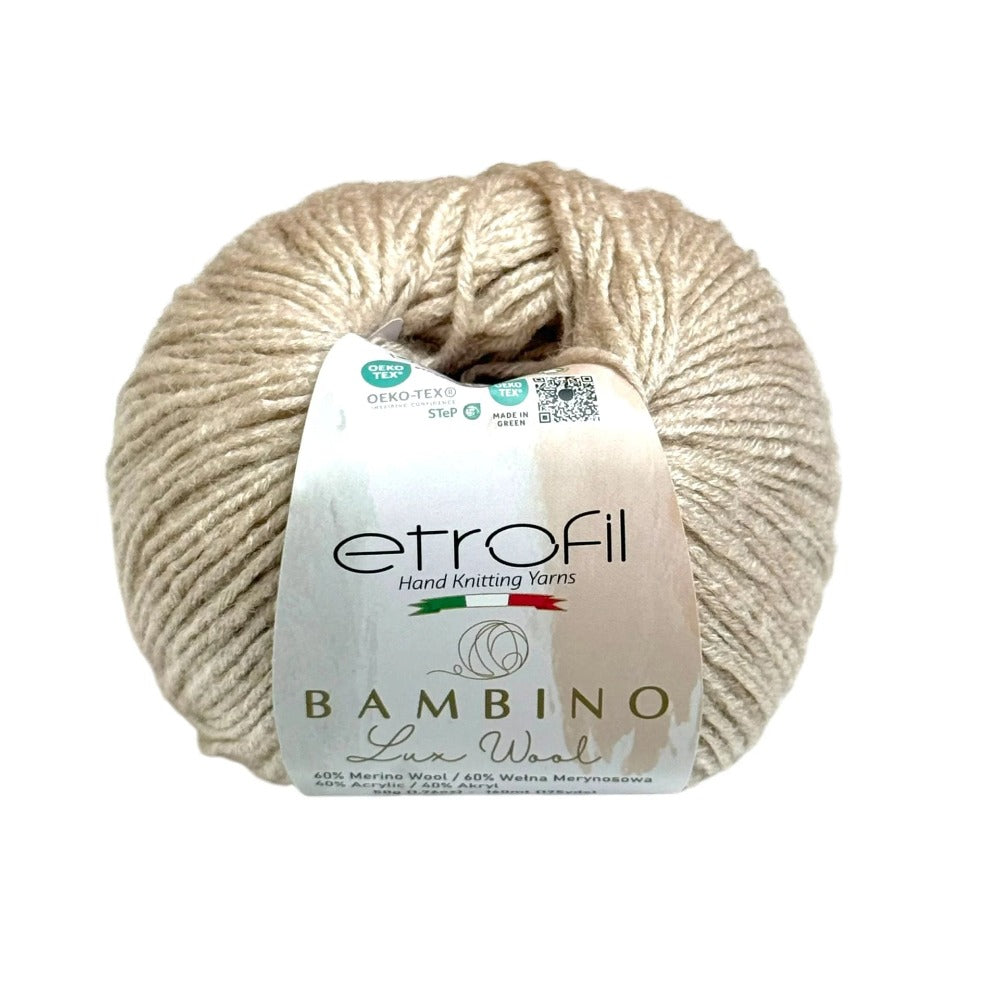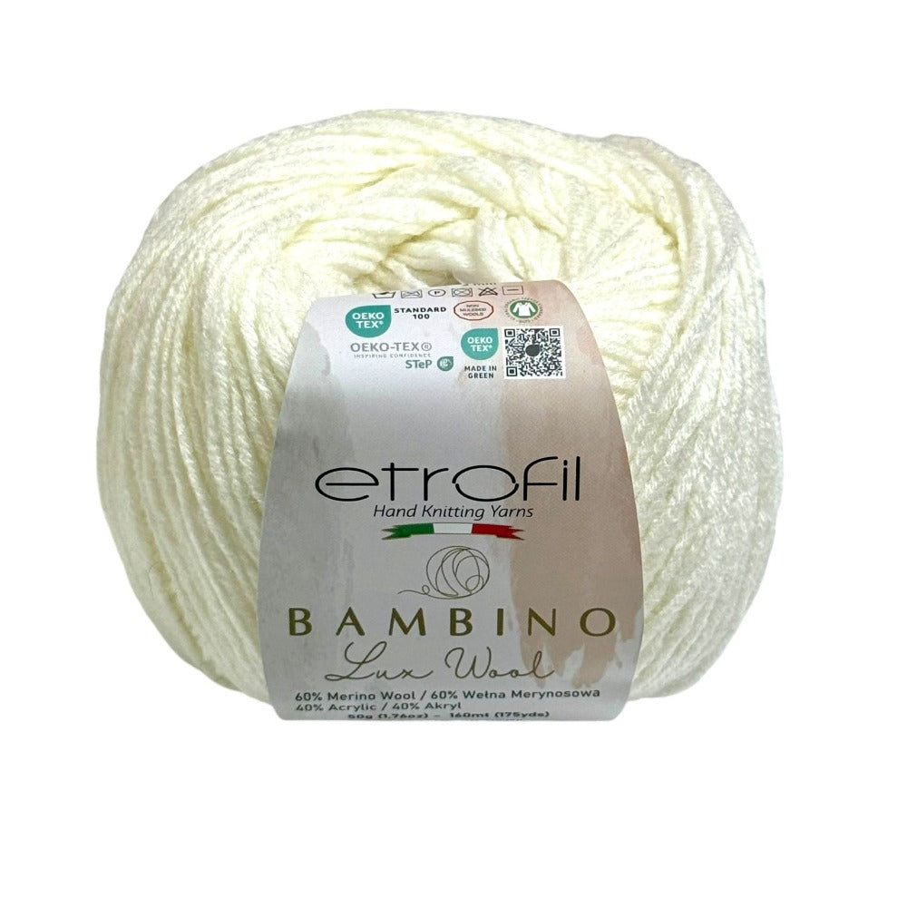 Etrofil Bambino Lux Wool est un fil raffiné, confectionné à partir de fibres de laine mérinos de première qualité, reconnues mondialement pour leur douceur, leur chaleur et leur confort exceptionnels. La laine mérinos soigneusement sélectionnée constitue le cœur de cette collection, offrant une texture lisse et douce au toucher.