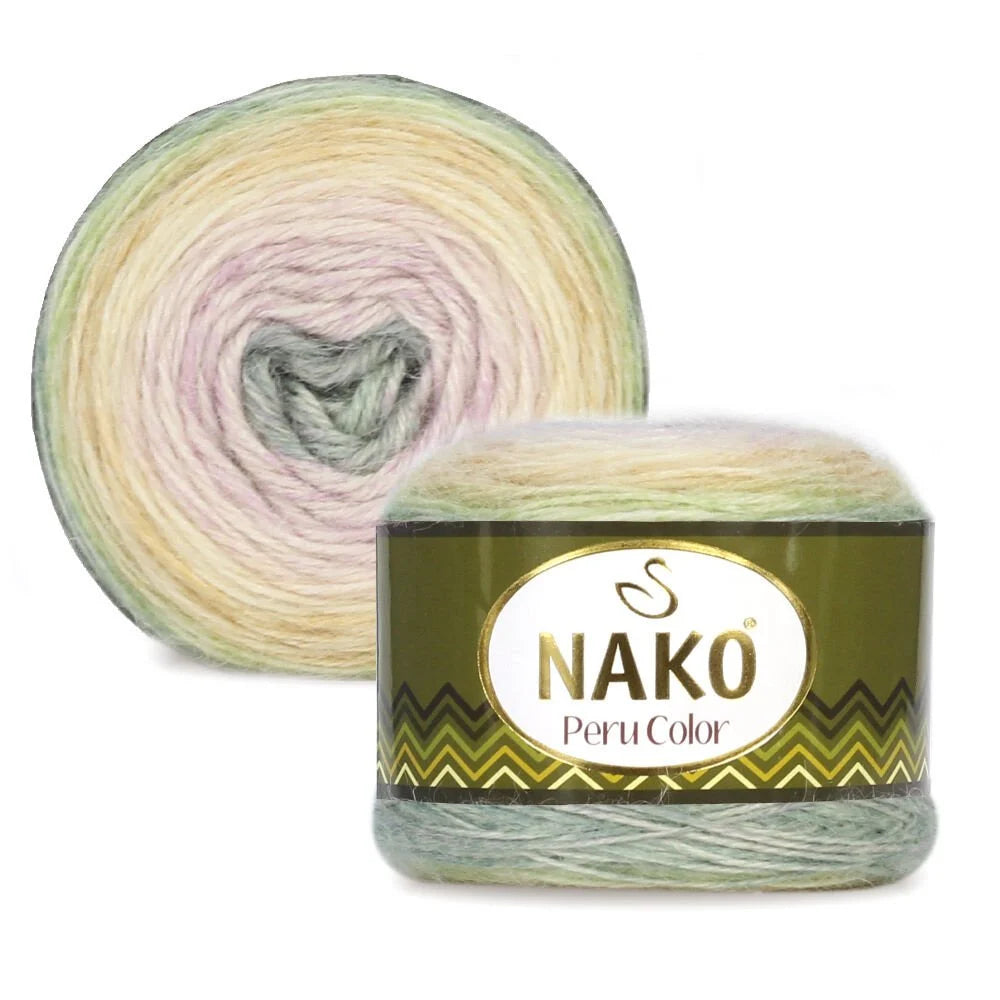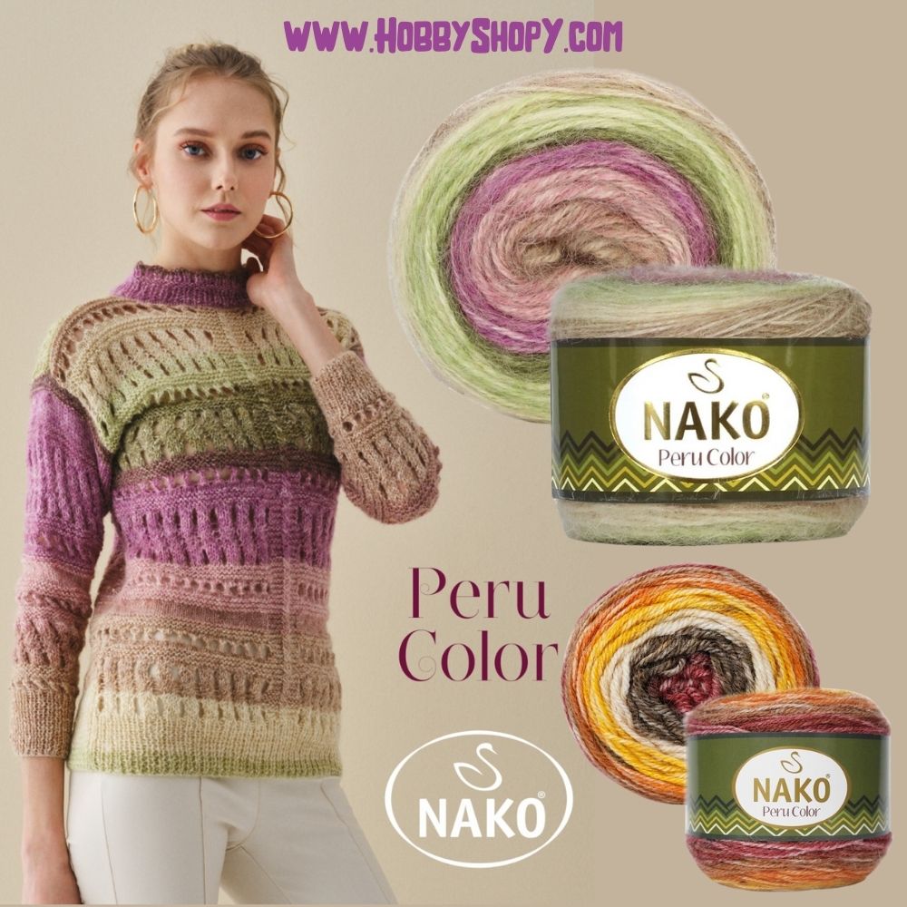 Nako Peru Color is a high-quality yarn made of 25% Alpaca, 25% Wool, and 50% Premium Acrylic. With a weight of 100 grams and a yardage of 310 meters, it is perfect for creating warm and cozy garments in the fall and winter seasons. Its versatile nature makes it suitable for a variety of projects, including sweaters, scarves, hats, and home decor items. Choose from a range of beautiful patterns and let your creativity shine with Nako Peru Color.